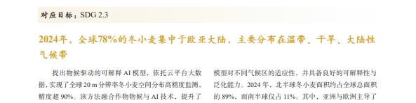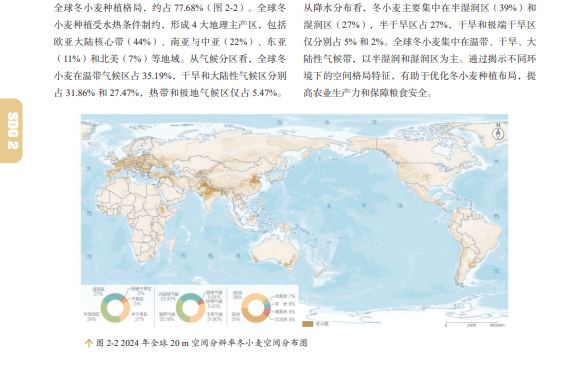 该项案例成果依托物候驱动的新型可解释AI模型,突破传统监测技术局限,实现了全球尺度20米分辨率冬小麦空间分布的高精度测绘,总体精度超过90%。研究首次系统揭示2024年全球冬小麦有78%集中分布于欧亚大陆,其中亚洲与欧洲合计占比达77.68%,北半球占全球总面积89%。通过融合多源卫星遥感与云计算技术,团队精准刻画了冬小麦在温带(35.19%)、干旱(31.86%)和大陆性气候区(27.47%)的空间格局,为优化全球粮食生产布局提供了关键科学依据。此项研究直接服务于联合国可持续发展目标SDG2“零饥饿”,通过创新的大数据监测方法支撑农业生产力提升,为全球粮食安全治理提供了中国方案。报告中特别强调,发展SDGs指标的大数据监测评估新方法是“后2030议程”的重要方向,而该案例研究成果正是这一方向的成功实践。