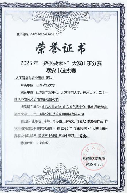 2025年8月,“数据要素X”大赛山东分赛泰安市选拔赛顺利举办,数字中国研究院(福建)邱炳文老师团队携参赛作品《作物种植信息数据集构建及应用》在2025年“数据要素X”大赛山东分赛泰安市选拔赛数据产业创新赛道中荣获一等奖。