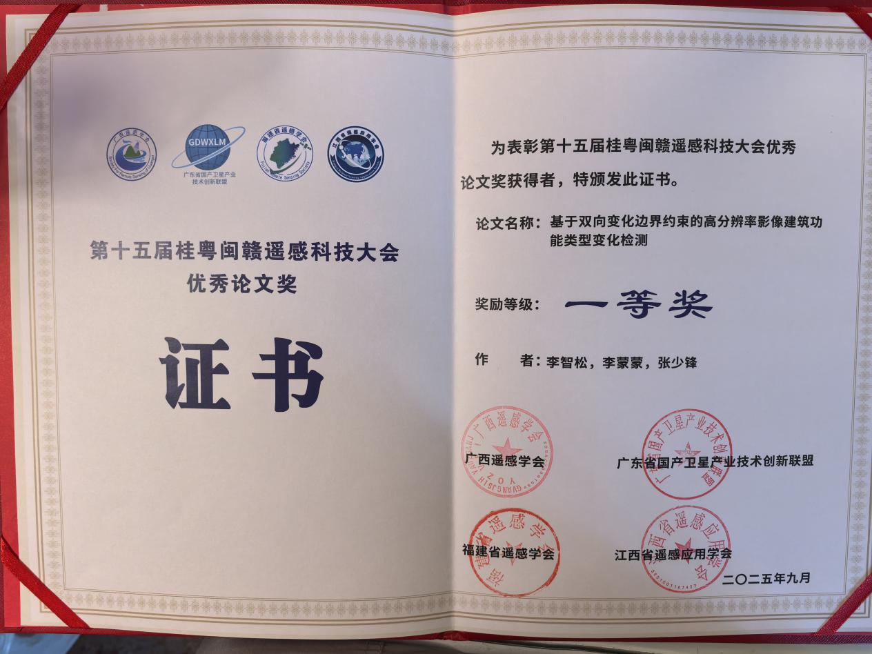 2025年,第十五届桂粤闽赣遥感科技大会成功召开。数字中国研究院(福建)李蒙蒙老师的《基于双向变化边界约束的高分辨率影响建筑功能类型变化检测》论文,荣获优秀论文奖一等奖。