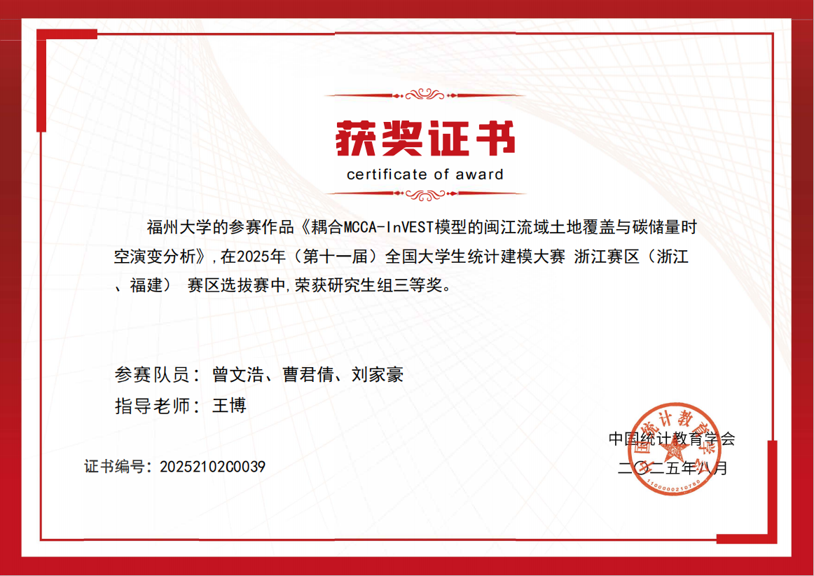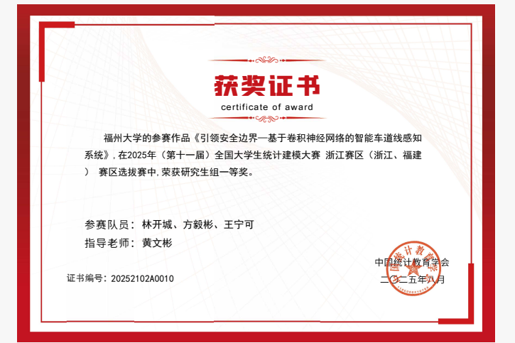 2025年8月,第十一届全国大学生统计建模大赛正式开赛,大赛由中国统计教育学会主办。数字中国研究院(福建)林开城、方毅彬、王宁可三位学生的参赛作品荣获全国大学生统计建模大赛浙江赛区(浙江、福建) 研究生组一等奖,曾文浩、曹君倩、刘家豪三位学生的参赛作品荣获全国大学生统计建模大赛浙江赛区(浙江、福建) 研究生组三等奖。