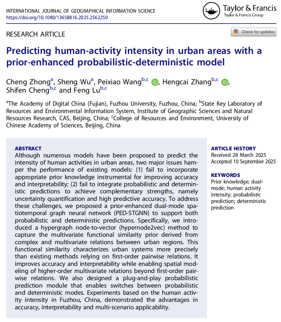 论文引用:Cheng Zhong, Sheng Wu, Peixiao Wang, Hengcai Zhang, Shifen Cheng & Feng Lu (23 Sep 2025): Predicting human activity intensity in urban areas with a prior-enhanced probabilistic-deterministic model, International Journal of Geographical Information Science, DOI: 10.1080/13658816.2025.2562250