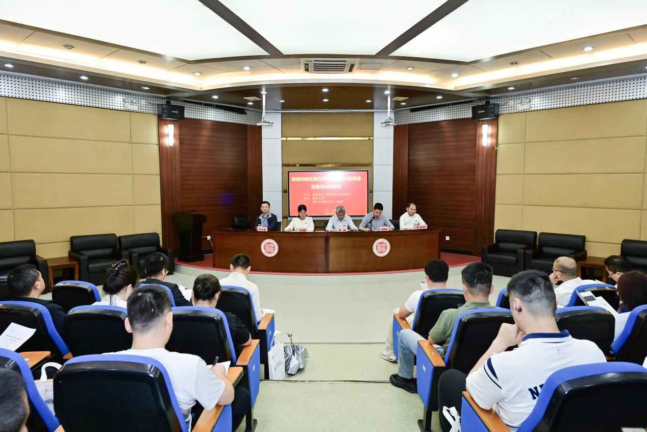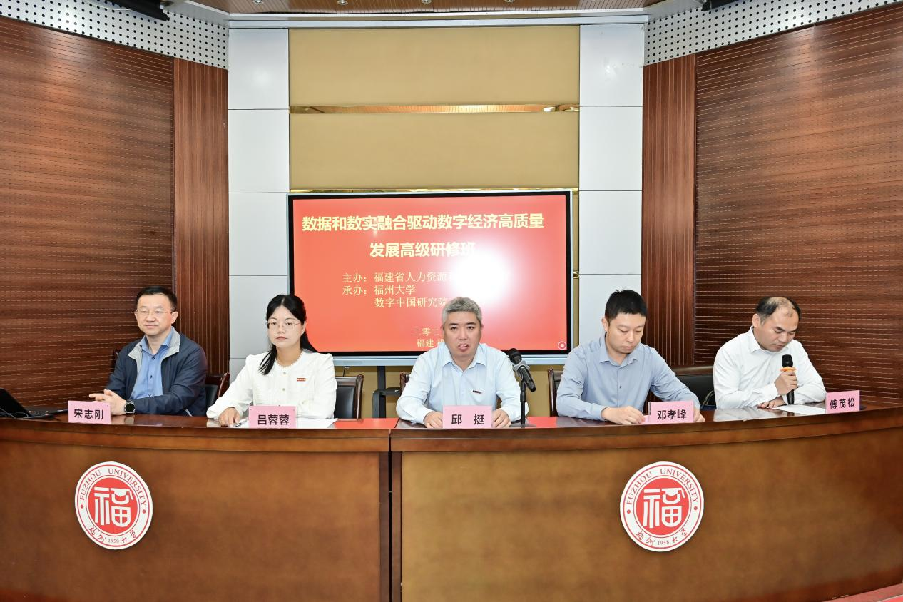 10月21日上午,由国家人力资源和社会保障部主办,福建省人力资源和社会保障厅、福州大学、数字中国研究院(福建)承办的“数据和数实融合驱动数字经济高质量发展”国家级高级研修班在福州大学怡山校区开班。福州大学邱挺副校长、福建省人力资源和社会保障厅职业能力建设处邓孝峰处长、福州大学人事处、数字技术管理办公室、数字中国研究院(福建)负责人出席开班仪式,来自全国14个省、直辖市的62名培训班学员参加开班仪式。